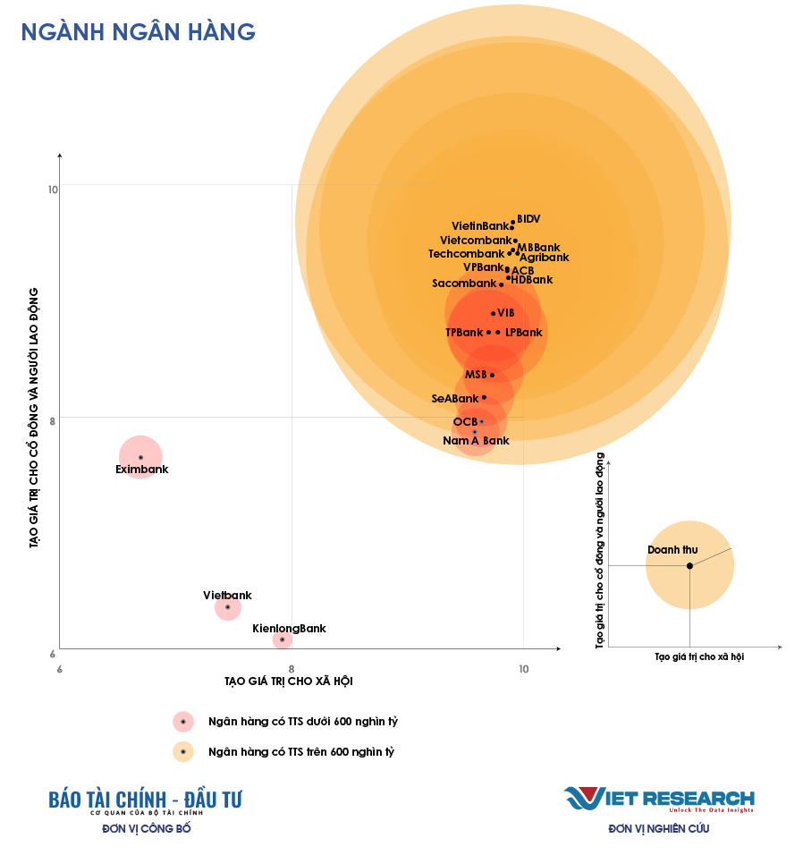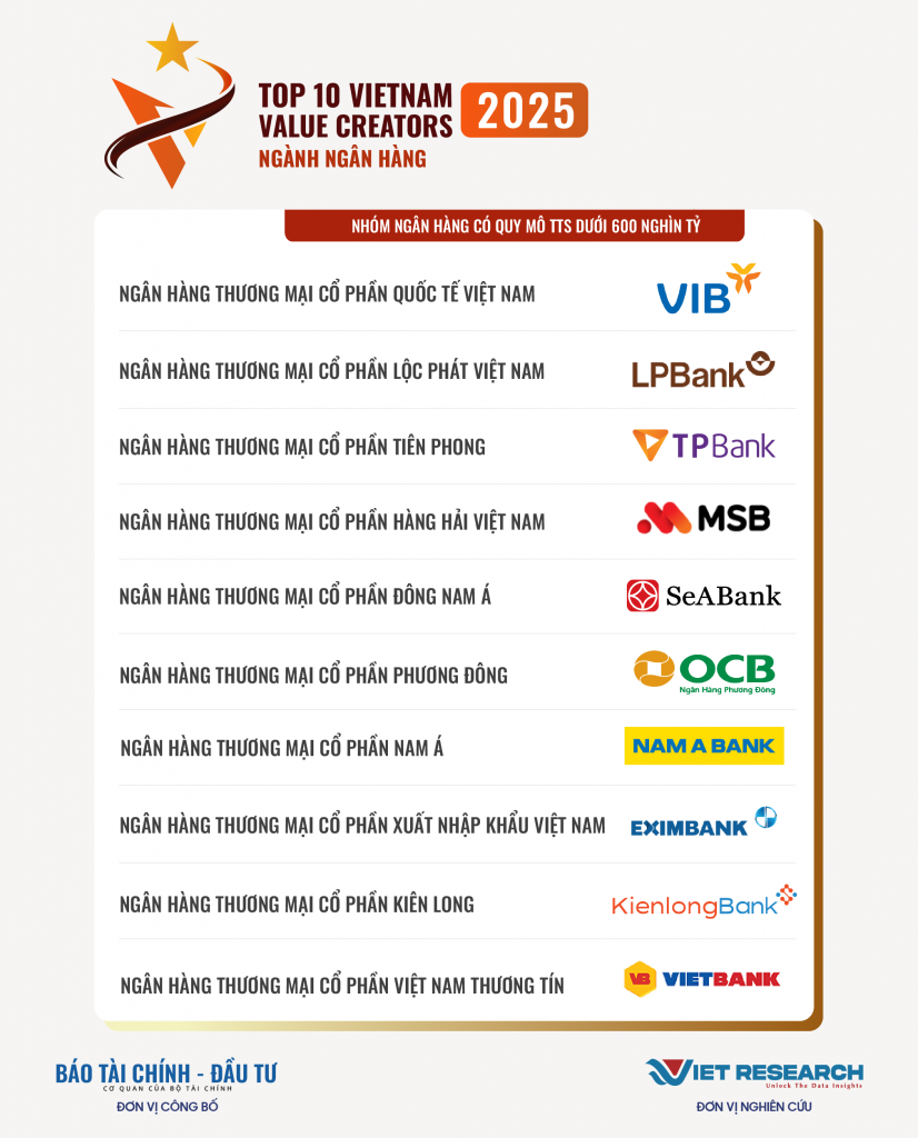 Trong khuôn khổ Chương trình Nghiên cứu toàn quốc về các Doanh nghiệp tạo giá trị hàng đầu Việt Nam, Viet Research phối hợp với Báo Tài chính – Đầu tư (Bộ Tài chính) công bố Top 10 Ngân hàng tạo giá trị hàng đầu Việt Nam 2025. Đây là những doanh nghiệp tiên phong trong việc tạo dựng giá trị cho nền kinh tế và xã hội, thể hiện qua:quy mô và tốc độ tăng trưởng; lợi nhuận và đóng góp cho ngân sách; môi trường, chính sách và phúc lợi lao động; cam kết về ESG và đổi mới sáng tạo.