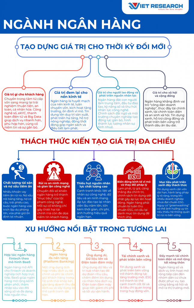 Nhìn về tương lai gần, bức tranh ngân hàng Việt Nam được định hình bởi những xu hướng mới mẻ mang tính chuyển đổi. Giai đoạn 2025–2030 dự kiến sẽ chứng kiến những thay đổi sâu rộng trong mô hình hoạt động ngân hàng. Để tiếp tục tạo giá trị vượt trội, các ngân hàng cần nắm bắt và đi đầu trong các xu hướng này, biến chúng thành lợi thế chiến lược. Có 5 xu hướng chính đang định hình diện mạo mới của ngân hàng trên hành trình kiến tạo giá trị theo khảo sát và nghiên cứu Top 10 Ngân hàng tạo giá trị hàng đầu Việt Nam 2025 của Viet Research.