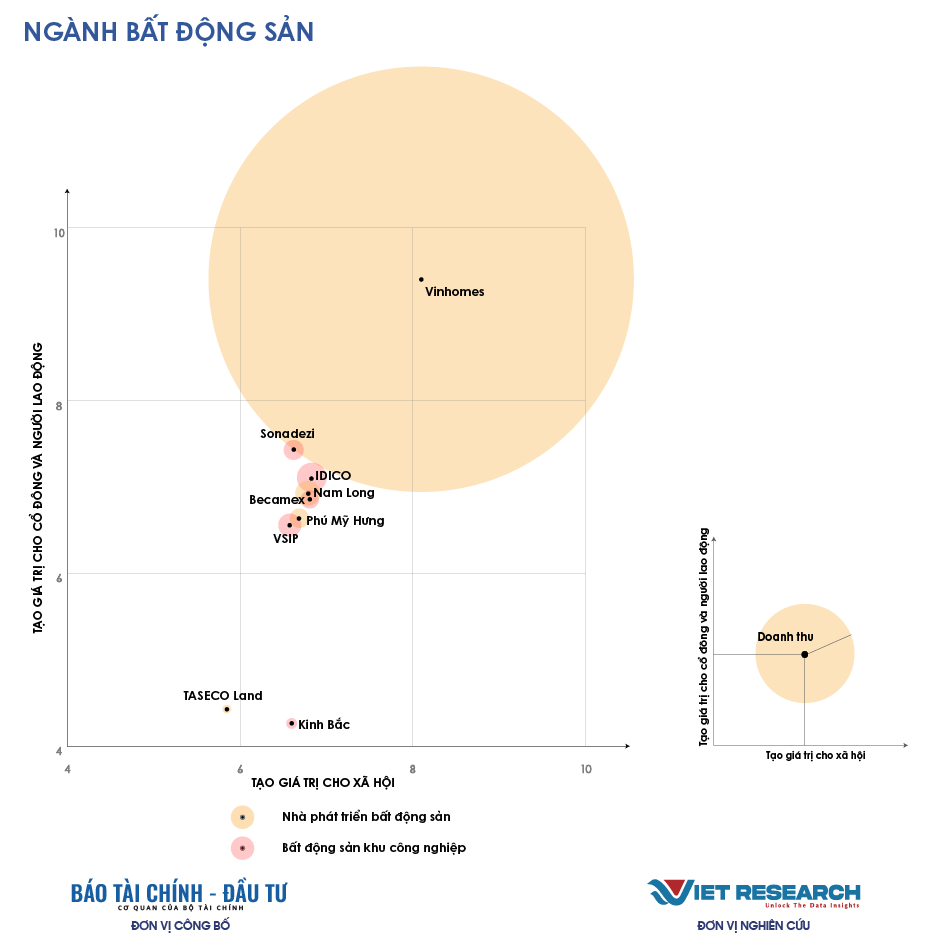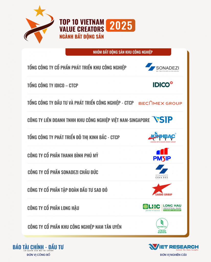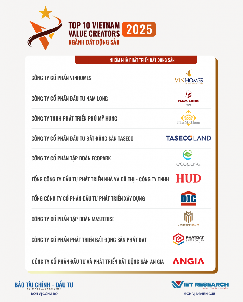 Trong khuôn khổ Chương trình Nghiên cứu toàn quốc về các Doanh nghiệp tạo giá trị hàng đầu Việt Nam, Viet Research phối hợp với Báo Tài chính – Đầu tư (Bộ Tài chính) công bố Top 10 Doanh nghiệp tạo giá trị hàng đầu Việt Nam 2025 – Ngành Bất động sản. Đây là những doanh nghiệp tiên phong trong việc tạo dựng giá trị cho nền kinh tế và xã hội, thể hiện qua:quy mô và tốc độ tăng trưởng; lợi nhuận và đóng góp cho ngân sách; môi trường, chính sách và phúc lợi lao động; cam kết về ESG và đổi mới sáng tạo.