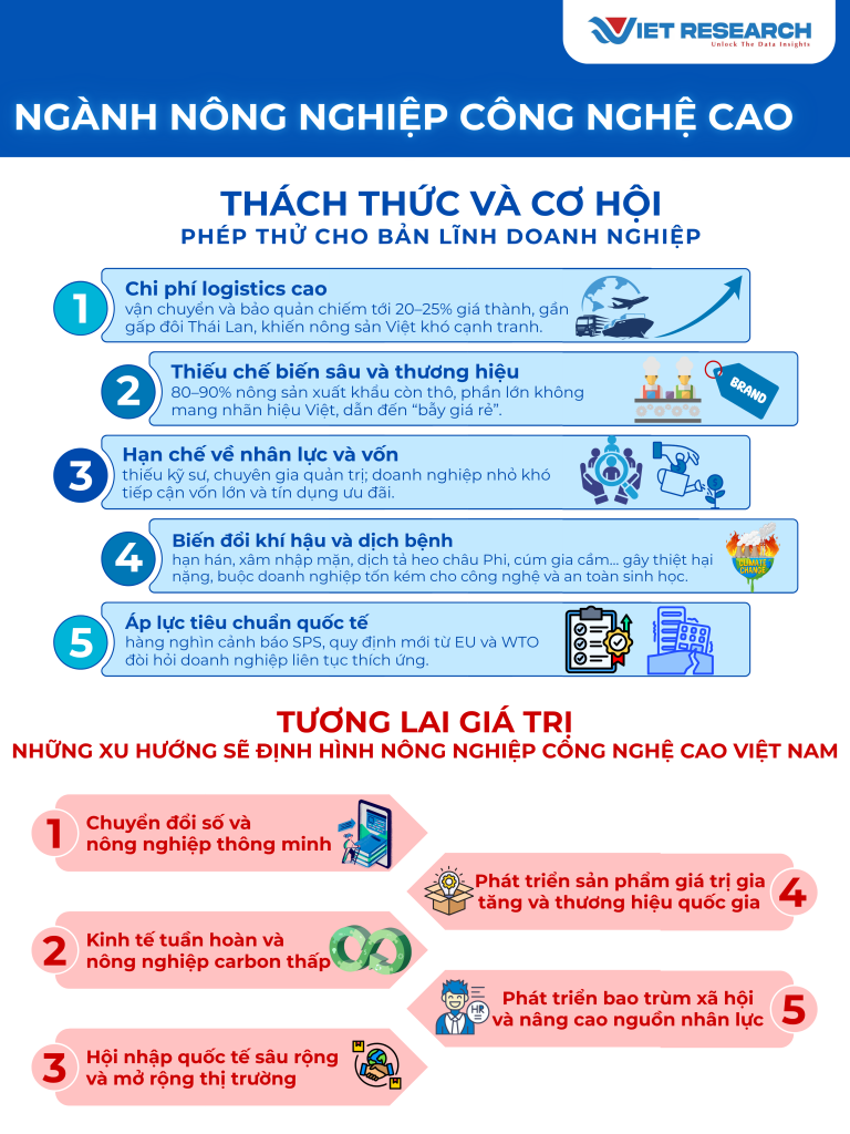 Dẫu phía trước vẫn còn những thách thức về chi phí logistics, nhân lực, vốn đầu tư hay biến đổi khí hậu, nhưng triển vọng tương lai của ngành là rất tươi sáng. Động lực từ chuyển đổi số, kinh tế tuần hoàn và hội nhập quốc tế sẽ tiếp tục giúp doanh nghiệp Việt Nam vươn lên dẫn dắt, đưa nông nghiệp bước sang một tầm cao mới – tầm cao của giá trị bền vững và toàn diện. Khi đó, nông nghiệp Việt Nam không chỉ dừng lại ở “đủ ăn, đủ xuất”, mà sẽ trở thành nền nông nghiệp giàu đẹp, hiện đại và gắn kết với sự phồn vinh chung của đất nước.