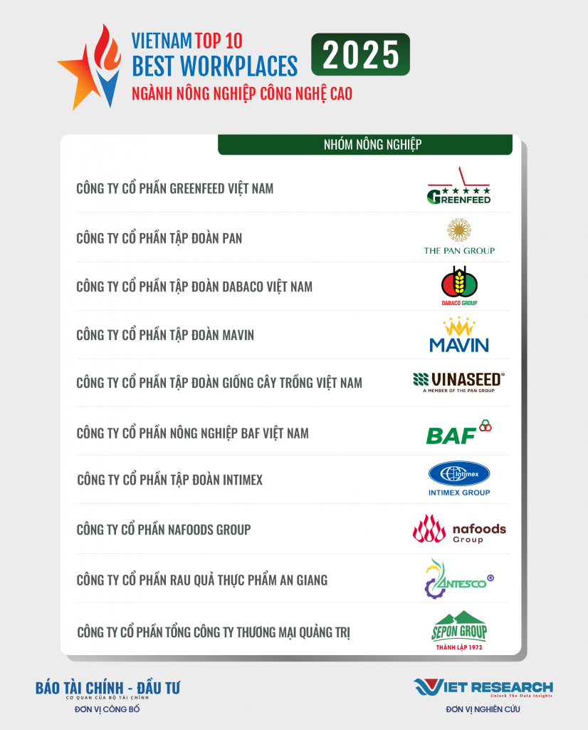 CÔNG BỐ TOP 10 NƠI LÀM VIỆC TỐT NHẤT VIỆT NAM 2025 – NGÀNH NÔNG NGHIỆP CÔNG NGHỆ CAO