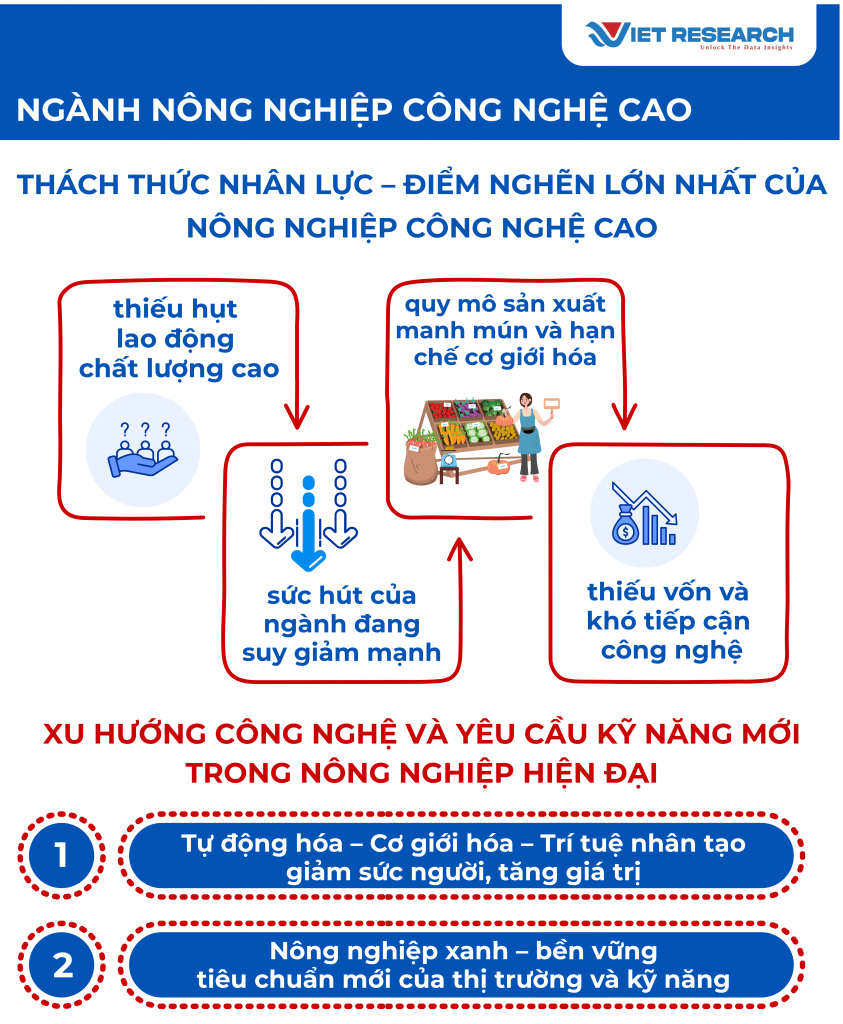 85,7% chuyên gia đánh giá mức độ ứng dụng nông nghiệp công nghệ cao ở Việt Nam mới ở giai đoạn khởi đầu, còn nhiều dư địa phát triển. Khi các công nghệ như nông nghiệp chính xác (precision agriculture) – ví dụ tưới, bón phân chính xác theo từng cây – được phổ biến rộng rãi (hiện mới khoảng 50% doanh nghiệp ứng dụng), thị trường lao động sẽ thay đổi sâu sắc.