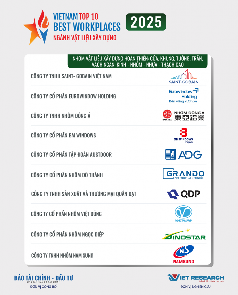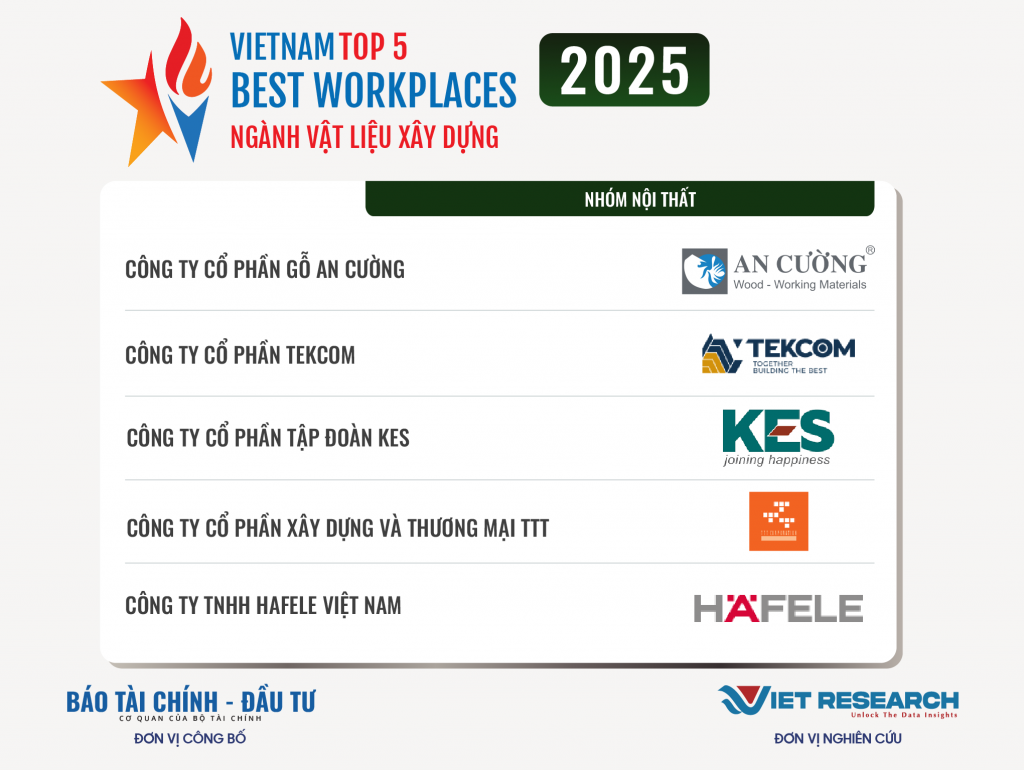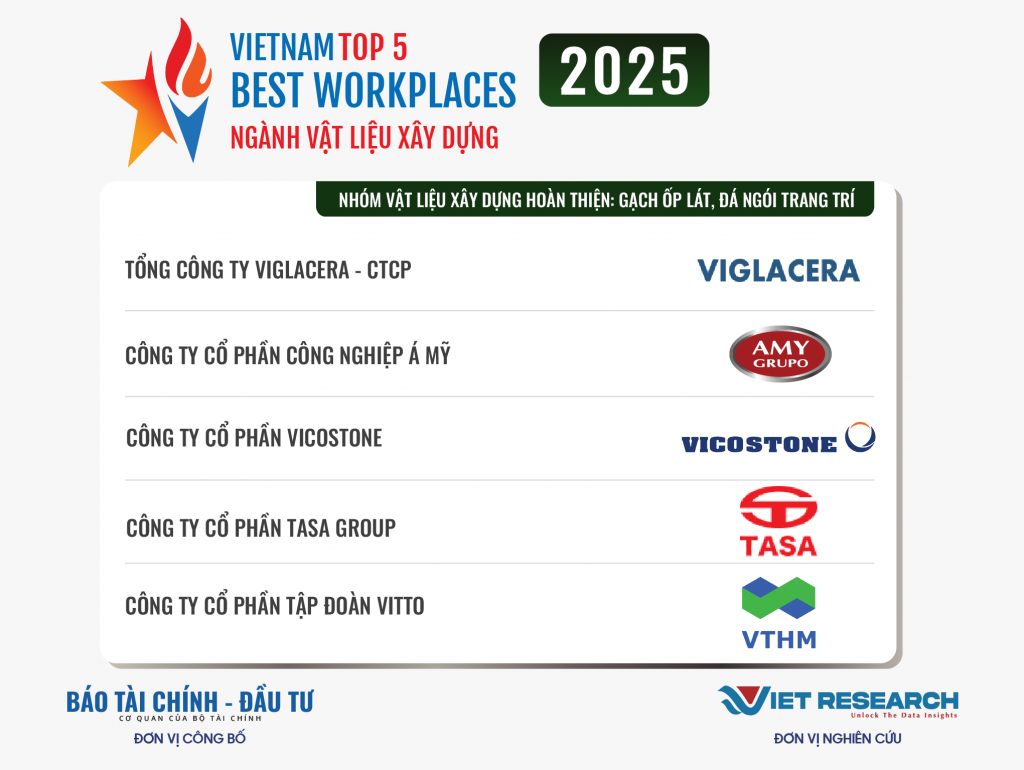 Nguồn: Top 10 Nơi làm việc tốt nhất Việt Nam – Ngành Vật liệu xây dựng (https://vbw10.vn/)