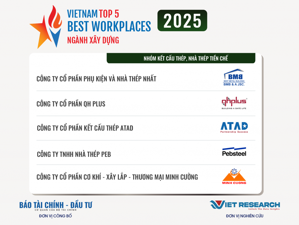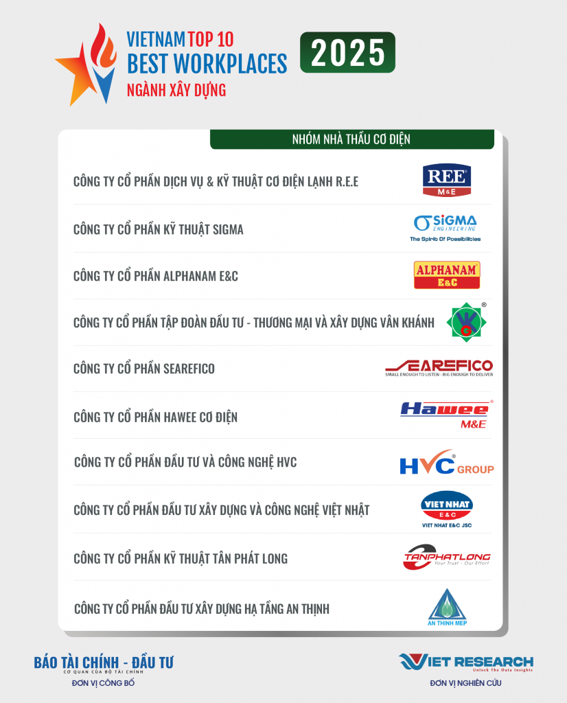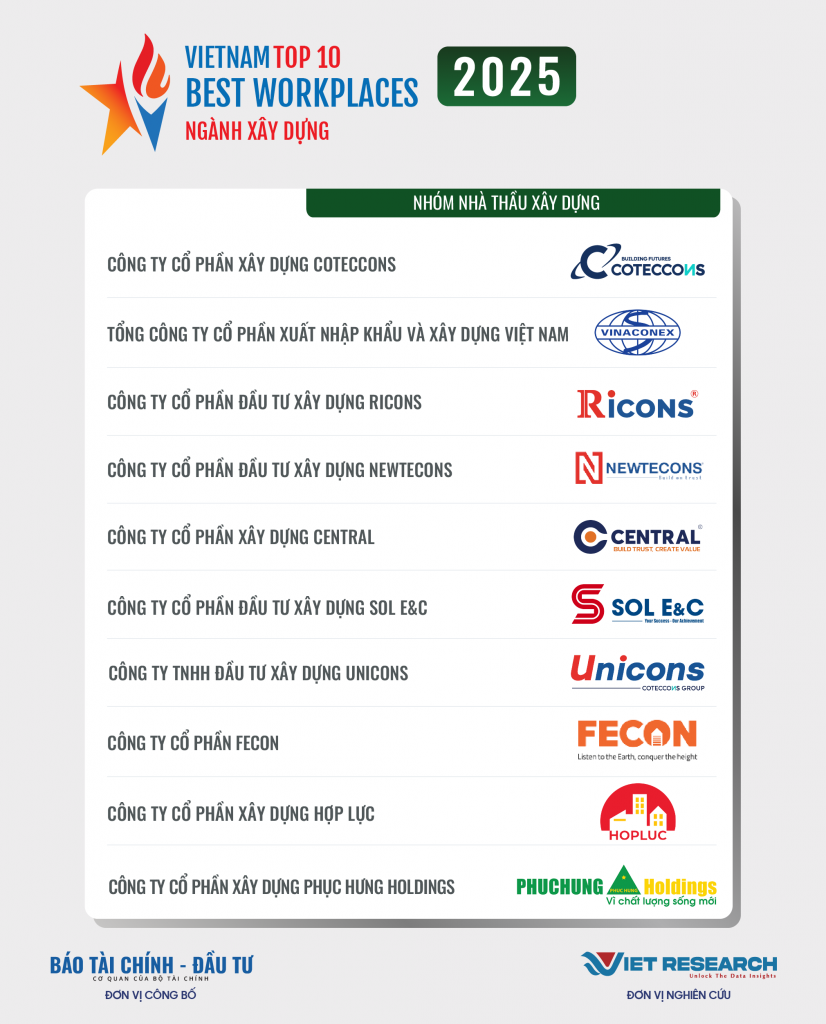 Nguồn: Top 10 Nơi làm việc tốt nhất Việt Nam – Ngành Xây dựng (https://vbw10.vn/)