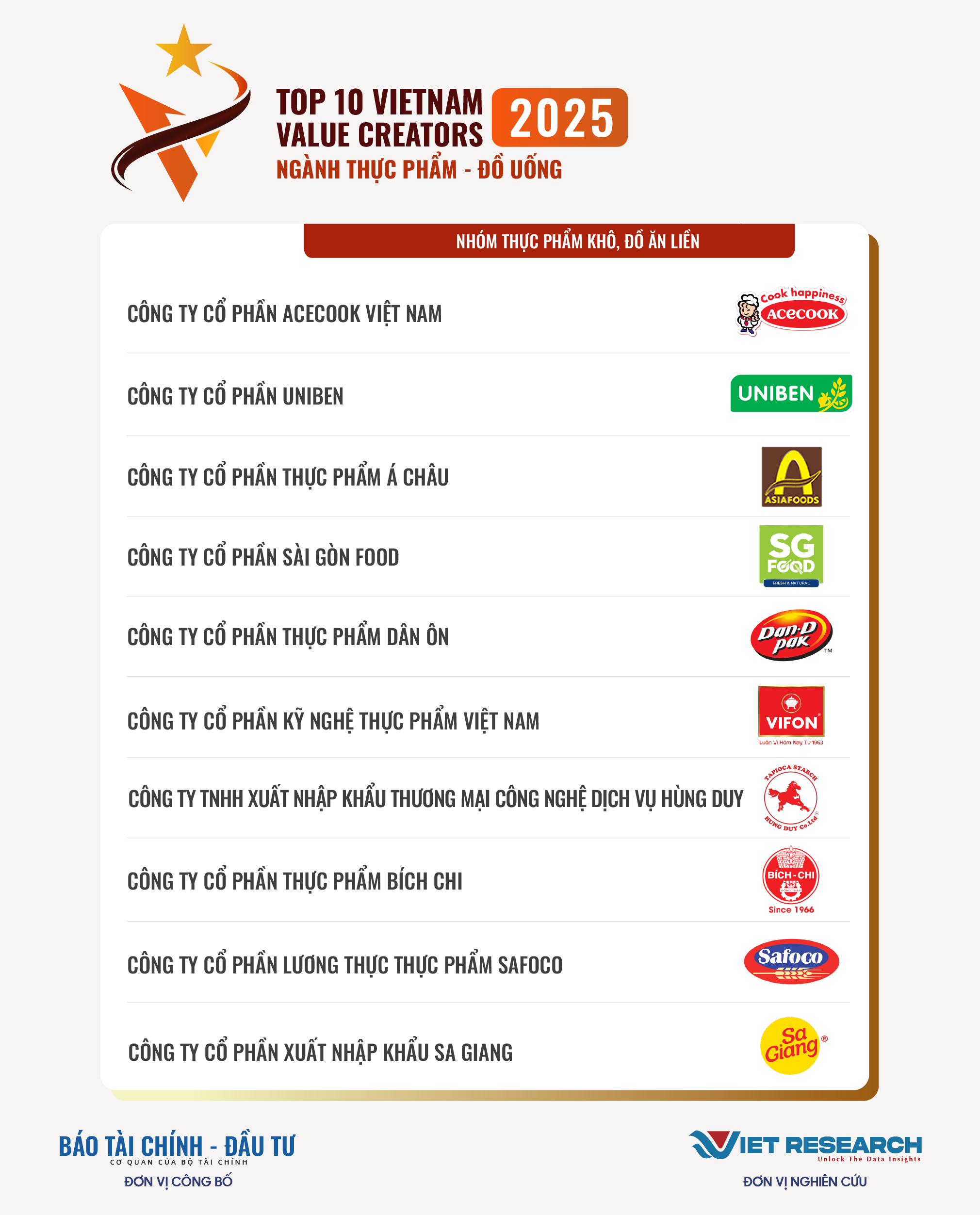 Viet Research phối hợp với Báo Tài chính – Đầu tư (Bộ Tài chính) công bố Top 10 Doanh nghiệp tạo giá trị hàng đầu Việt Nam 2025 – Ngành Thực phẩm – Đồ uống.