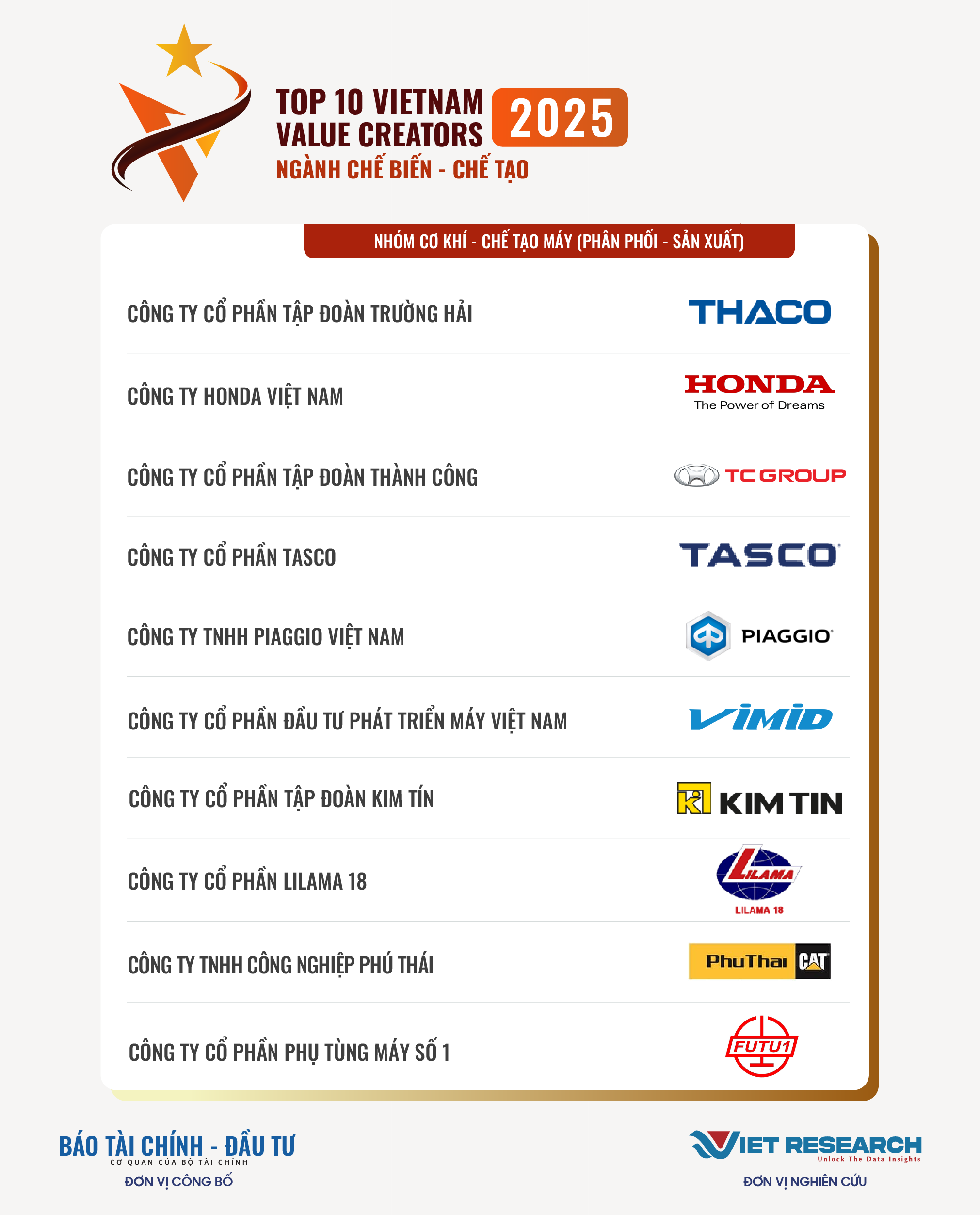Viet Research phối hợp với Báo Tài chính – Đầu tư (Bộ Tài chính) công bố Top 10 Doanh nghiệp tạo giá trị hàng đầu Việt Nam 2025 – Ngành Chế biến – Chế tạo.
