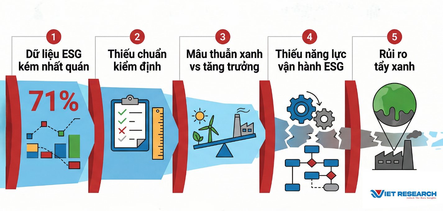 Dù đã cam kết, triển khai ESG và ghi nhận nhiều chuyển biến tích cực, khảo sát của Viet Research cho thấy các doanh nghiệp ngành Tài chính – Chứng khoán vẫn đang đối mặt với không ít khó khăn, có thể khái quát thành 5 nhóm chính: